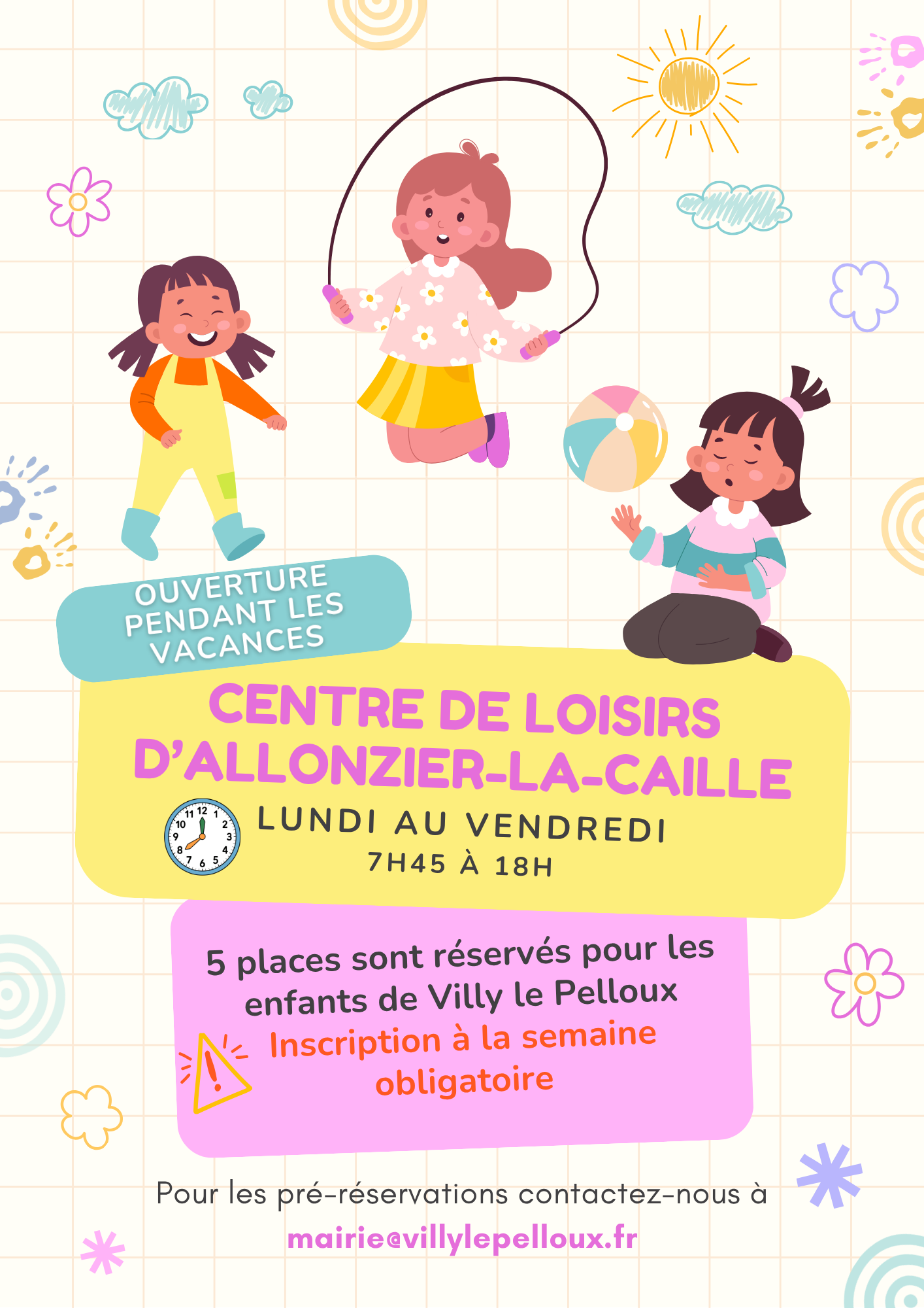 L’Accueil de Loisirs Sans Hébergement (ALSH) de la Commune d’Allonzier-la-Caille réserve 5 places durant les vacances scolaires pour les enfants de Villy le Pelloux. L’accueil de loisirs est fermé durant les vacances de Noël.